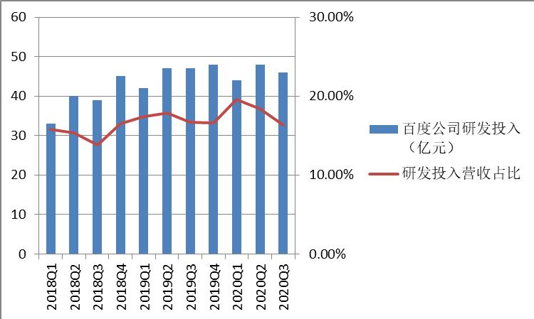 2018年百度研发投入占公司营收的15.34%;2019年全年高达183亿,占公司营收的17.04%。横向对比,华为2018年的研发投入营收占比为14.9%;2019年华为这一数据达到15.3%;小米过去三年的这一数据一直持续在3%-4%之间;京东2019年这一数据为3%;美团2019年这一数据为9%。