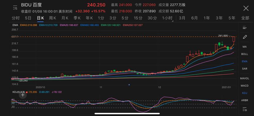 10月14日,百度上涨7.1%,站稳130美元;11月,股价持续上涨,站上140美元;12月股价疯狂拉升,1个月内从138.99美元上涨到216.24美元,单月暴涨55.58%;2021年1月,股价直接从200美元出头再度攀升至240美元左右。在去年12月和今年1月的短短1个月出头的时间,百度股价有三个交易日涨幅超过10%,整体上涨72.85%。