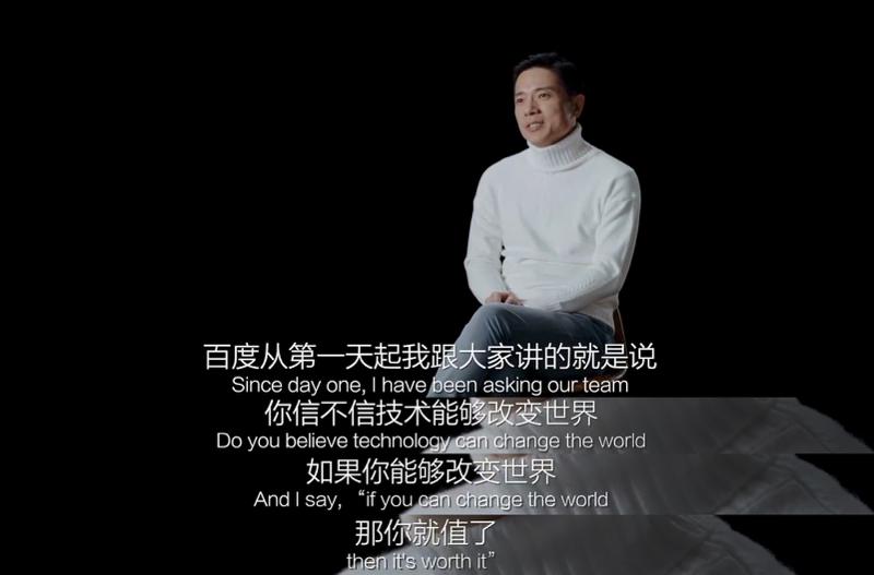 百度二十周年纪录片《二十度》中,李彦宏说过这样一句话:“百度从第一天起,我跟大家讲的就是说,你信不信技术能够改变世界,如果你能够改变世界,那你就值了。”