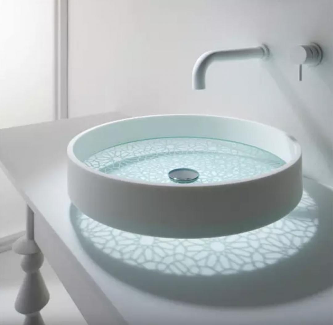 用光影效果呈现出来的波光粼粼的洗手盆,像是漂浮在洗手台上一样