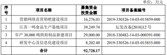 据了解,一鸣食品计划将募集资金中的9.27亿元,分别投入营销网络直营奶吧建设项目、江苏一鸣食品生产基地项目、年产3万吨烘焙制品新建项目和研发中心及信息化建设项目。