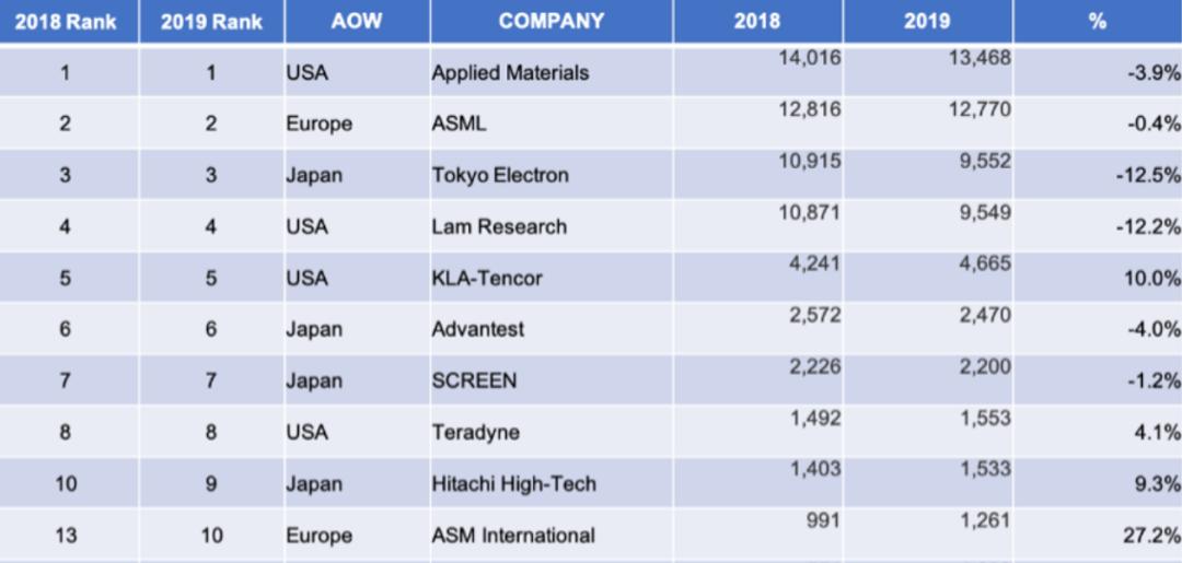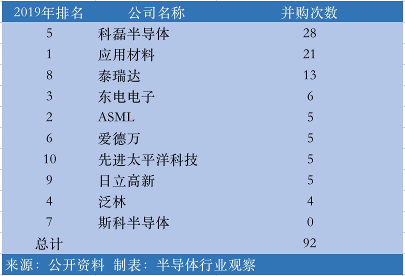 如今的半导体设备行业已经是高度集中的市场格局,应用材料、阿斯麦、东京电子、泛林半导体、科磊半导体2019年牢牢占据了全球前五的位置。而这些厂商正是在前一轮的积极并购后慢慢定型,成为了业内的标杆企业。
