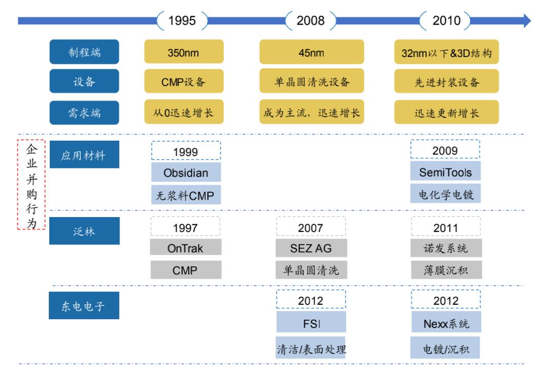 无论是应用材料、泰瑞达又或者是ASML,他们的并购目的或有不同,但最终的目标都是为了实现企业的良好成长。回顾和总结半导体设备企业的成功并购史,我们发现一个较为共性的特征,并购往往隐含着对于下游技术和设备需求的布局。以应用材料、泛林和东电电子为例,在历史上制程发展的三个关键时点,均选择了积极并购以布局下游需求激增的关键设备和技术,提升自身的竞争能力,在对应的领域实现了较好的收入增长。
