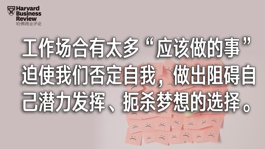 去做我们认为自己应该做的事,而不是自己想做的事。我们在日常工作中容易掉进这个陷阱。有一些塑造我们事业的不成文的规定确实是好的,比如完成学业后回报家庭,在工作中守时、保持礼貌。但工作场合有太多“应该做的事”,迫使我们否定自我,做出阻碍自己潜力发挥、扼杀梦想的选择。