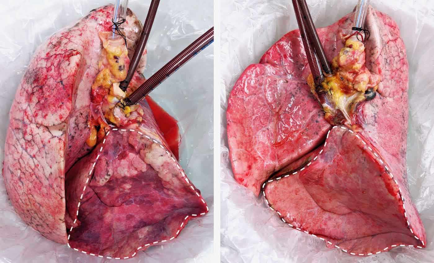 左图是已经受到损害、被拒绝移植的肺部,右边是和活猪循环系统连接后得到恢复的肺部,虚线里是损害区域的恢复情况|图片来自《自然医学》杂志及Medium
