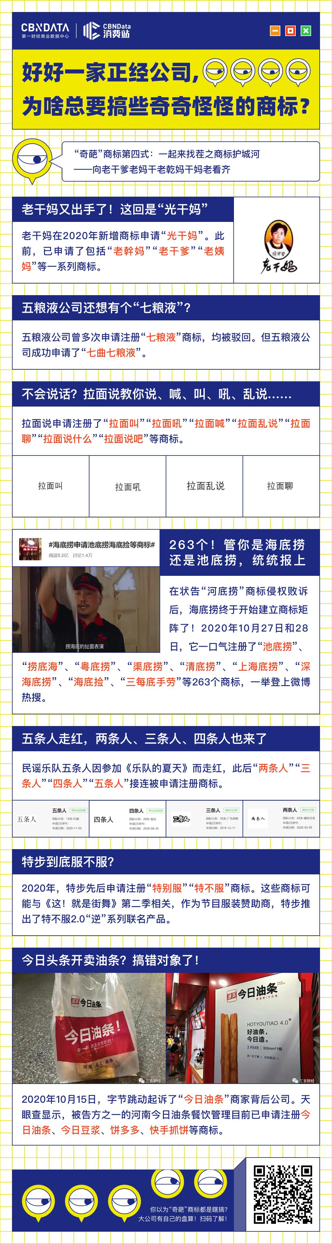 CBNData消费站盘点了2020年的抓人眼球的商标相关事件,将其分成了四个类别,分别对应着谐音梗、网红、流行语、品牌保护等关键词。