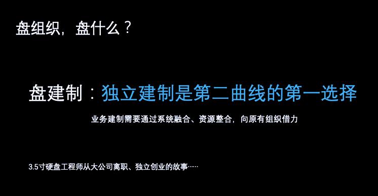 我主要想讲,在盘独立建制里面的误区跟问题。独立建制的第一个挑战是融资难。我不知道大家有没有意识到,当第一曲线做起来后,你去做第二曲线,那将来无论是第一曲线还是第二曲线,怎么去对外融资,甚至怎么上市都是问题。