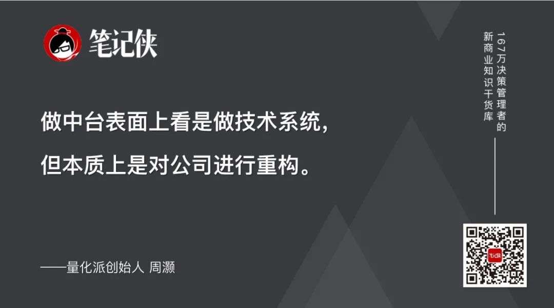 做中台表面上看是做技术系统,但本质上是对公司进行重构。以前垂直的体系要变成扁平的,以前整个业务线都在一起的要被拆开,领导的管理权限要从管产品、技术、业务变成只管业务,把中间的很大部分权利放出来给到大家。