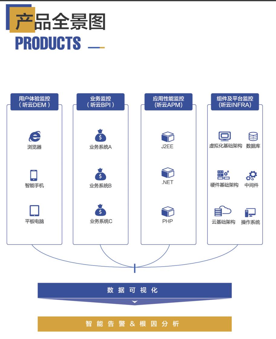 · 3.0阶段:2019年至今。这一阶段,听云在成熟的APM产品和业务的基础之上,进一步开发智能监控和分析(AIops)市场、搭建听云智能监控和分析平台,从多源数据采集、到数据中台、AI中台、到效率提升、故障排除、智能优化的场景应用均有完全的覆盖。目前,听云也有针对云原生的监控方案推出,并入选CNCF(云原生云原生计算基金会)的世界云原生全景图。