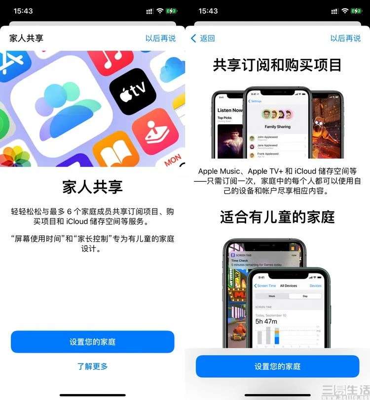 在iOS、iPadOS,以及MacOS的Apple ID设置界面,我们可以看到醒目的“家人共享”选项。它就是苹果专为家庭用户所准备的特殊账号体系,它可以允许最多6名家庭成员加入一个群组,从而在账号之间建立起共享与互助的关系。