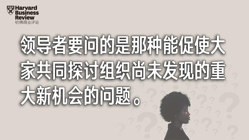 解释一下:我不是让你提出有针对性的问题,比如“如何把工作效率提升10%?”“这里是不是漏了什么?”之类的。领导者要问的是那种能促使大家共同探讨组织尚未发现的重大新机会的问题,例如: