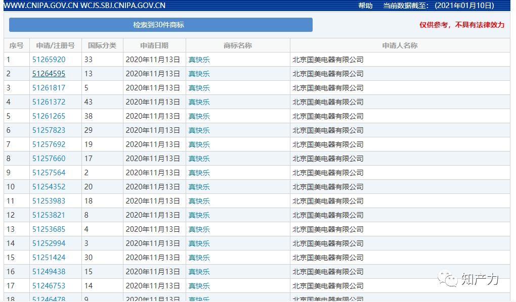 另据中国商标网查询,北京国美电器有限公司(下称国美)分别于2020年11月12日、11月16日、12月16日分别申请注册30件“真快乐”商标,截至目前,该商标都处于等待实质审查状态。
