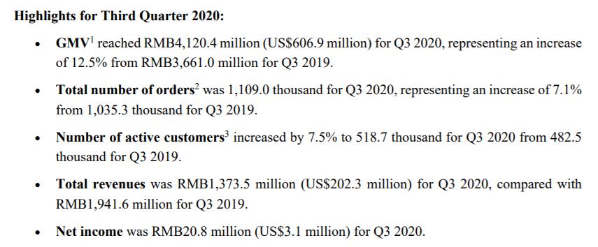 2020年Q3财报显示其季度业绩亮点,GMV达到41亿元,同比增长12.5%;总订单量为110.9万单,同比增长7.11%;活跃买家数为52万,同比增长7.5%;总营收达到13.7亿元,净收入为2080万元。