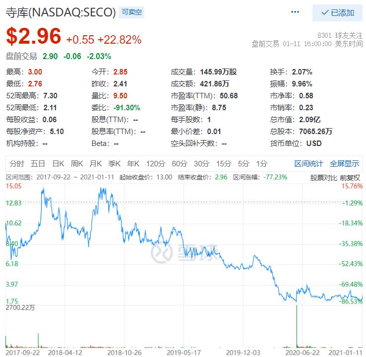 直到美东时间1月11日下午四点收盘,寺库报2.96美元/股,涨幅达到22.82%,市值回归2.09亿美元。