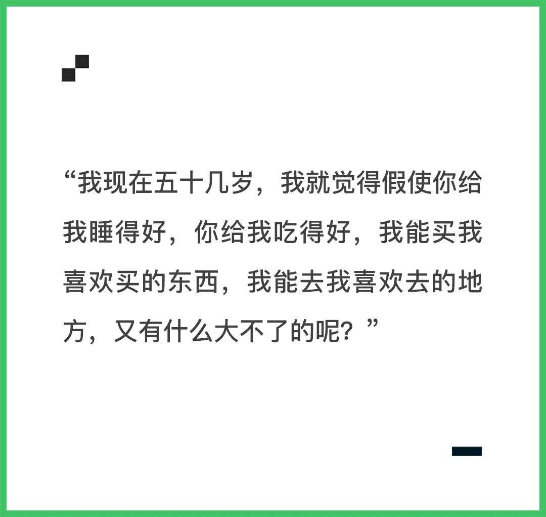 女性总是容易被规训,被揣测,但在这样一个发声就能被听见的环境里,路可以走得很长。总有人觉得20岁之后,30岁就要下坠了,但其实还有40岁那一段,50岁那一段,“我现在五十几岁,我就觉得假使你给我睡得好,你给我吃得好,我能买我喜欢买的东西,我能去我喜欢去的地方,又有什么大不了的呢?”