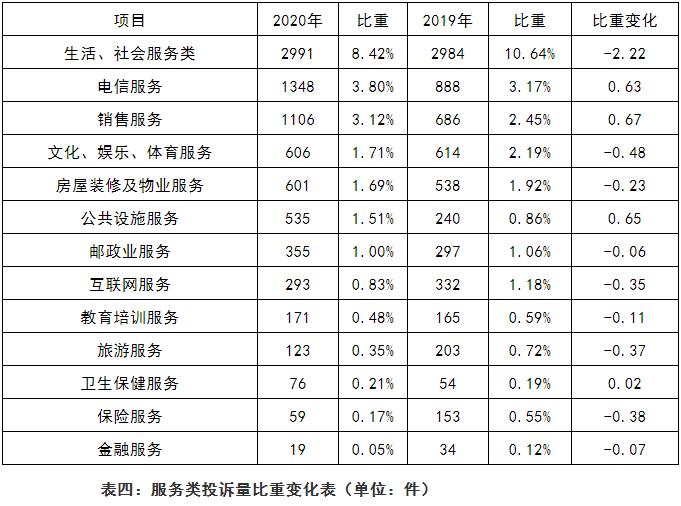 服务类投诉8283件,占投诉总量的23.33%。其中:生活、社会服务类投诉2991件,占服务类投诉总量的36.11%,位居第一;电信服务投诉1348件,占服务类投诉总量的16.27%,位居第二;销售服务投诉1106件,占服务类投诉总量的13.35%,位居第三;文化、娱乐体育服务、房屋装修及物业位居第四和第五位。