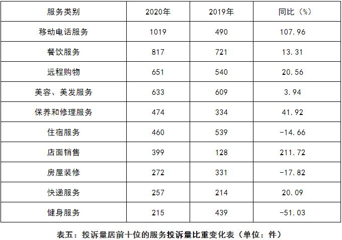 从服务类投诉中的具体服务看,居前五位的分别是:移动电话服务、餐饮服务、远程购物、美容美发服务、保养修理服务。