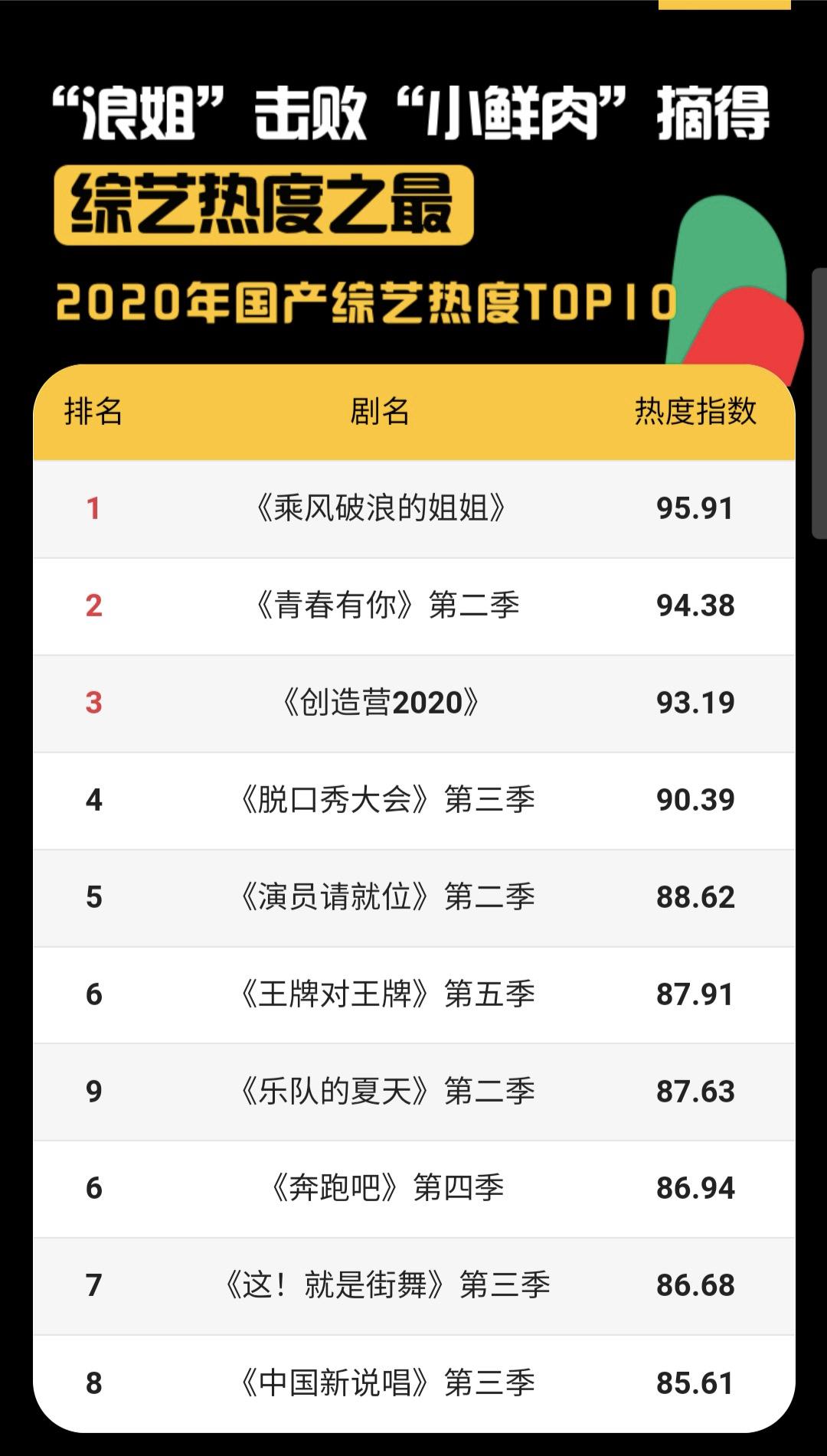 《2020腾讯娱乐2020白皮书》显示,去年国产综艺热度TOP10中,除排名第一的《乘风破浪的姐姐》外,榜单上剩下的九档节目均为已播出多季的“综N代”,包括《青春有你2》《创造营2020》《脱口秀大会3》《这!就是街舞3》等等头部内容。
