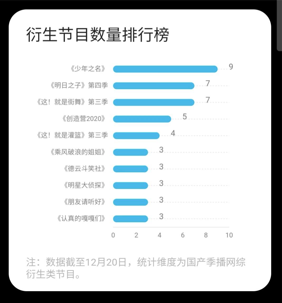 在这种创作趋于保守的环境下,头部综艺的衍生作品也大幅度增加。最多的如《少年之名》,有9档衍生节目。