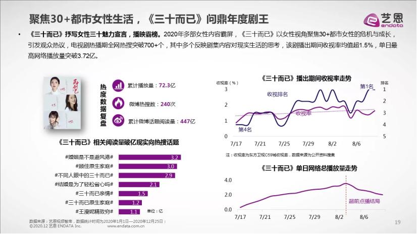 当中不乏现象级热度的作品,比如凭借对于30+女性生活的描写引爆热议的《三十而已》。根据艺恩的统计,该剧播出期间收获全网热搜700+,平均收视率超过1.5%,单日最高网络播放量高达3.72亿,并以77亿的播放量成为2020年年度剧王。