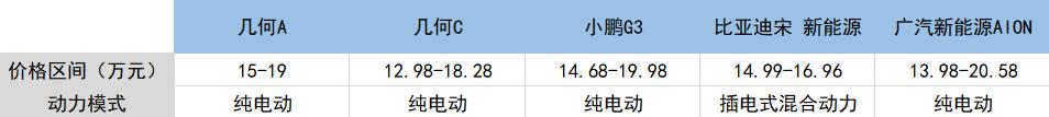 几何A和几何C销量颓势,问题还在于定价。虽然这个品牌发布之时美其名曰高端新能源品牌,但这两款车的价格区间均处于10-20万,而在这个价格区间的市场中,不仅有小鹏G3、比亚迪宋这样的强力对手,同时还被广汽新能源AION等车型所包围。