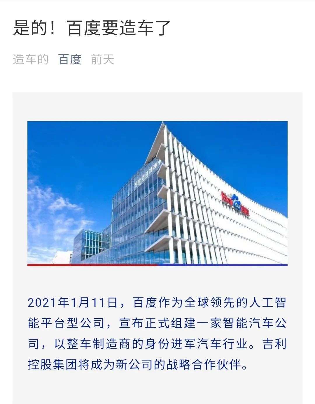 百度宣布与吉利联合造车,图源百度官方公众号