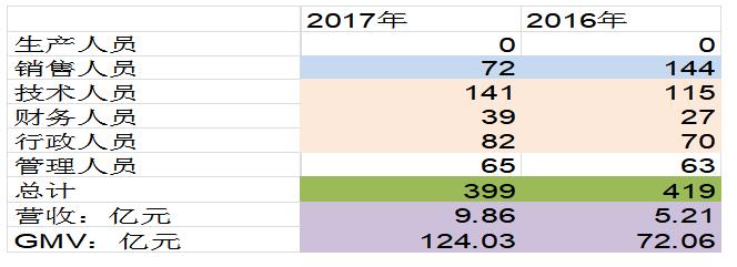而市场的质疑实则为:2017年收入、GMV同比大幅上涨,员工数量却不增反降。