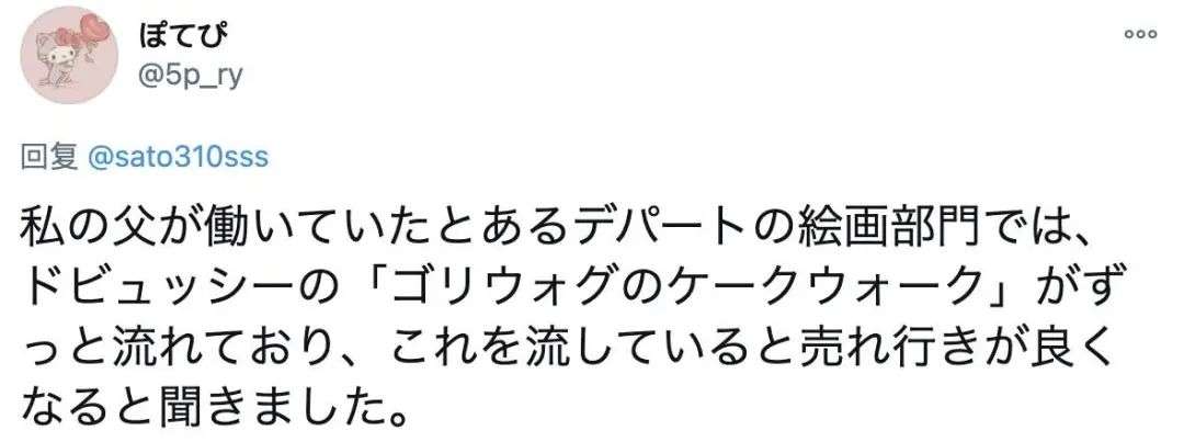 还有人说,他父亲在百货商店的艺术区里工作,那里会循环播放德彪西的曲子《Golliwog's Cakewalk》,那里的商品也的确卖得不错;还有像卖参考书、艺术书的地方,也都是以古典配乐为主。
