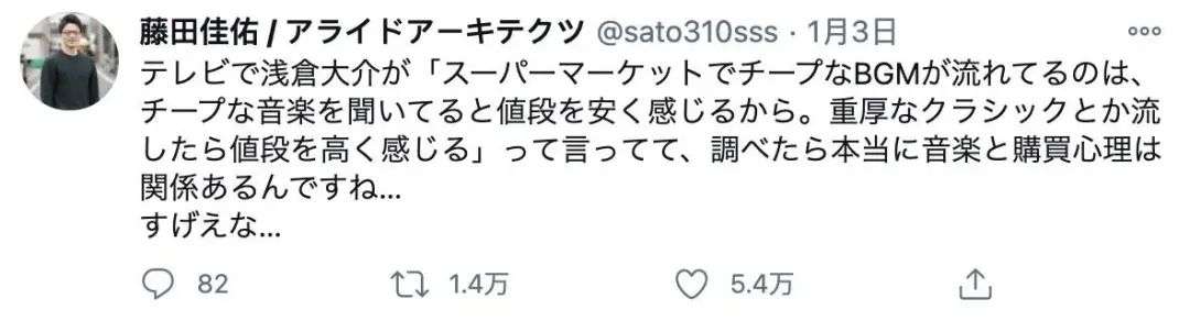 日本音乐家浅仓大辅在一档电视节目上说,超市里会播放那种听起来很廉价的音乐,是为了让顾客觉得这家店卖的东西很便宜。如果他们播放非常庄重、古典的音乐,人们就会觉得东西很贵了。我查了一下,发现音乐还真的会对购物心理产生影响……太厉害了……