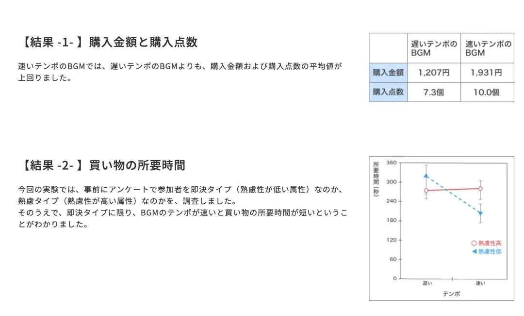 结果显示,快节奏 BGM 下的顾客,明显会比另一边的顾客更愿意花钱,而且买东西的数量也会更多,购物所需时间更短;而慢节奏则可以增加放松情绪,具体要选择哪种配乐,仍然要根据店铺的业务状态来使用。