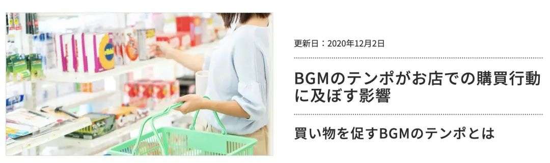 日本最大的背景音乐服务商 USEN,就曾展开过一次「商店购物行为是否会因 BGM 的节奏而改变」的实验。他们找来了 42 位 30-50 岁的男女性用户,分成慢节奏 BGM 和快节奏 BGM 两组顾客,同时租下了一家真正的便利店,让他们带着 10000 日元进行正常购物。