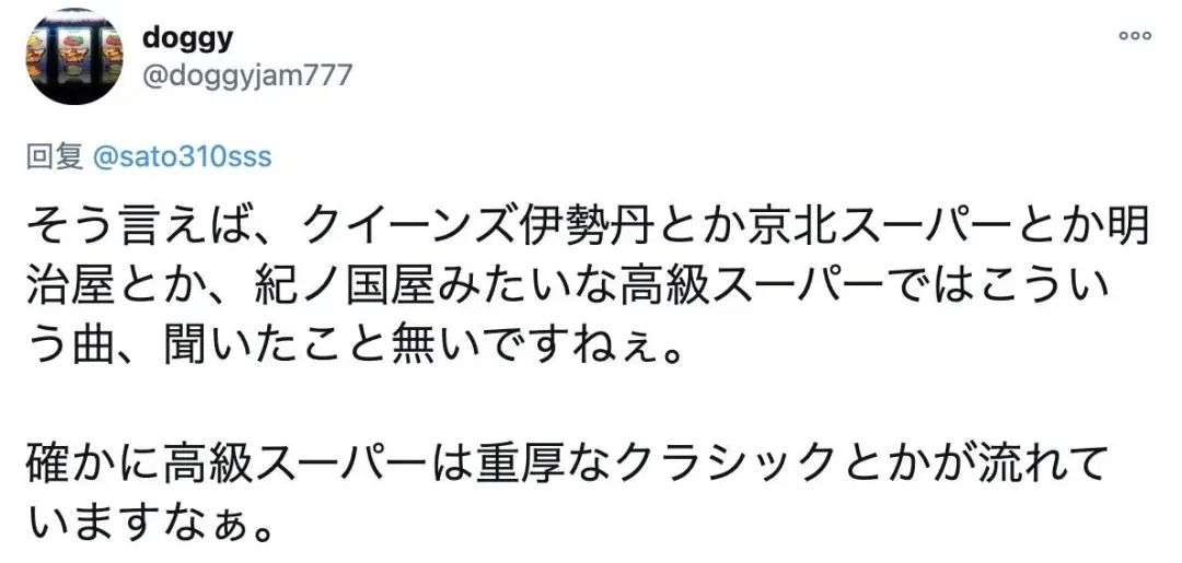 也有网友发现,自己「从未在伊势丹、京北、明治屋、纪之国之类的高端购物场所听到类似的歌曲,那里一般都播放比较沉稳的古典乐。」
