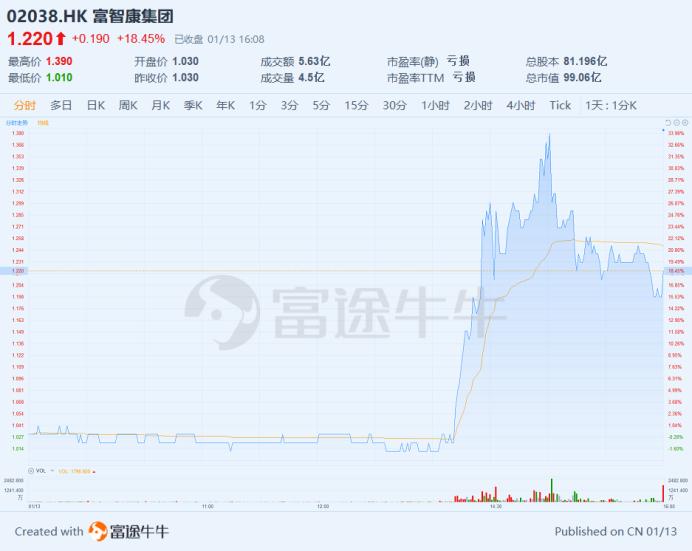 资金闻风而动,富智康股价直线拉升,一度大涨近34%,截至收市,涨幅回落至18%。