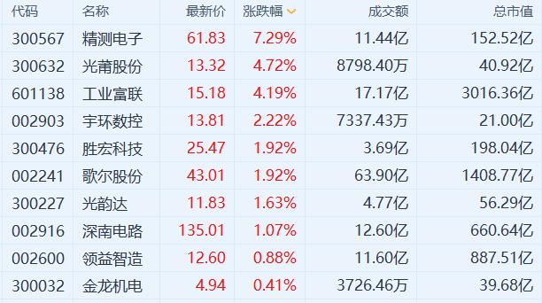 一人得道,鸡犬升天,相关概念股也随之集体大涨,港股鸿腾精密、云智汇科技涨超10%;A股工业富联收涨4%,精测电子、光莆股份等跟涨。