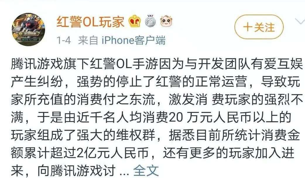 “第一步是积极跟发行方腾讯互娱进行沟通,请求对方开放内容更新的权限,没有得到许可;之后我们又跟版权方一起推动内容更新的许可权利,也没有取得成功。”有爱互娱在微博中表示。从初步处理的结果看,有爱互娱与腾讯的沟通并不顺利。这也点燃了玩家对《红警OL》长期高额投入的不满。2020年1月4日,微博名为“红警OL玩家”的用户发文称:“腾讯游戏旗下红警OL手游因为与开发团队有爱互娱产生纠纷,强势的停止了红警的正常运营,导致玩家所充值的消费付之东流,激发消费玩家的强烈不满”。