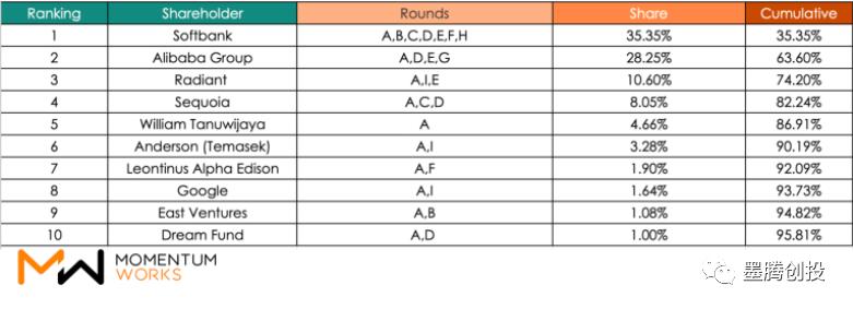 相比拥有Gojek超过了一共72%的股权的20大股东,Tokopedia这边要相对“精简”一些。