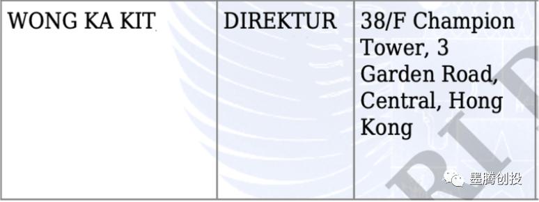 可以初步确定Radiant旗下三家公司与长江实业地产有限公司有着一定的联系,同时我们也在Tokopedia的董事会席位中发现了一名来自香港的董事-Wong Ka Kit. 其注册地址信息为香港中环的冠君大厦。