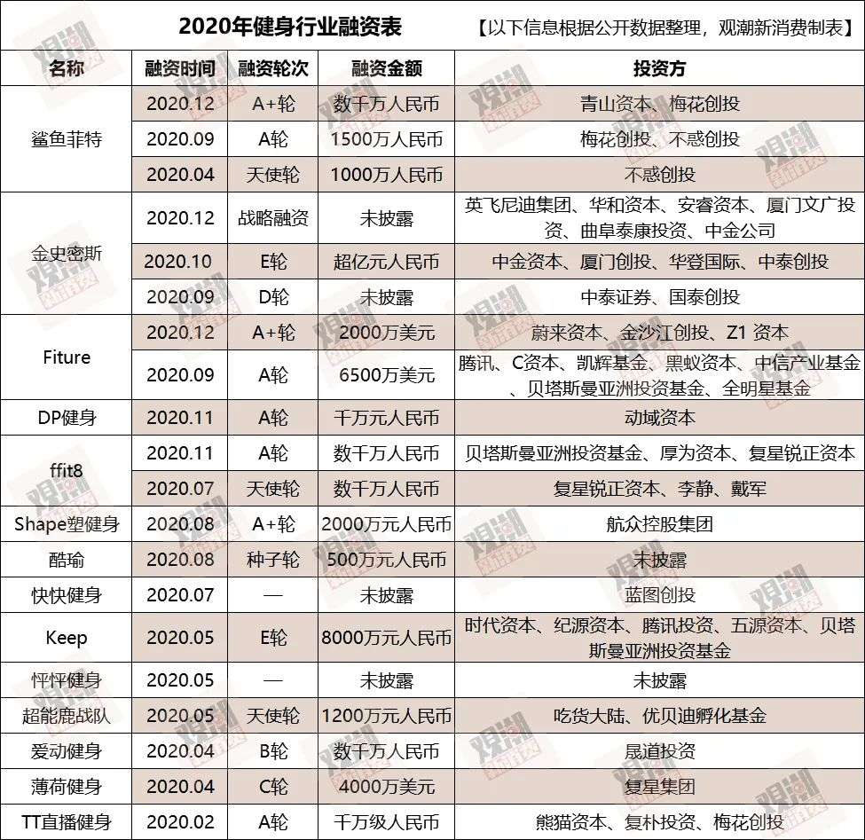 观潮新消费(ID:TideSight)根据网络公开数据不完全统计,2020年,中国健身行业共计发生20起融资,融资金额超10亿元。其中,家庭智能健身相关5起、健康食品领域4家公司获得7起融资。