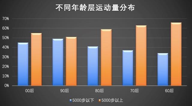 年龄维度上,60后每天平均运动步数最多,90后每天平均运动步数最少。90后每天运动5000步以上的占比51%,80后每天运动5000步以上的占比59%,70后每天运动5000步以上的占比63%,60后每天运动5000步以上的占比66%。