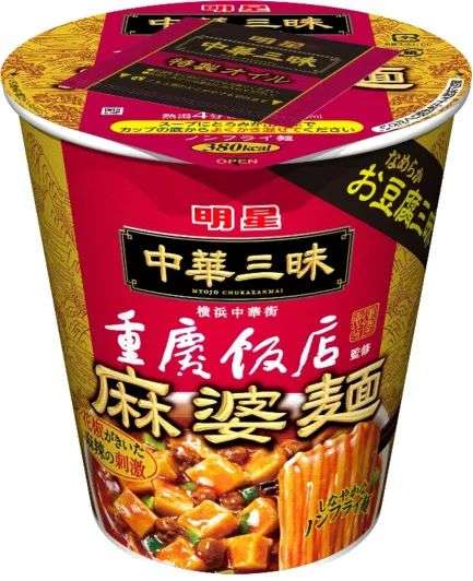 明星品牌邀请横滨唐人街上的四川料理老店“重庆饭店”,共同开发出这款将麻婆豆腐与杯面相结合的“中华三味”系列新品。产品极力还原麻婆面中的关键味觉特征:麻婆豆腐中花椒的香气和绞肉的口感。浓稠的汤和强烈的辛辣与麻辣的钩杆,豆腐柔软而光滑,并且增加了50%的肉末量,是驱赶一切饥饿,满足口腹之欲的用心美味。