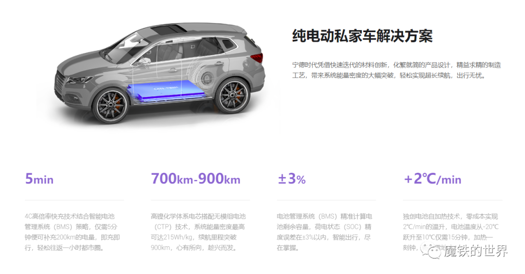 不过,在宁德时代官网的解决方案宣传资料里,有一款纯电动私家车解决方案,通过采用高镍化学体系电芯搭配无模组电池(CTP)技术,汽车的续航里程可以达到700公里——900公里,这个数据和蔚来ET7的续航里程较为接近,但宁德时代的CTP产品要到2030年才能量产。同时,CTP产品的能量密度是215Wh/kg,恰好正是宁德时代还未量产的前沿产品。