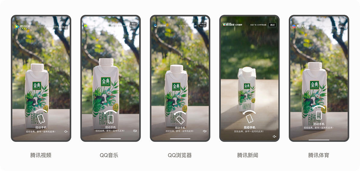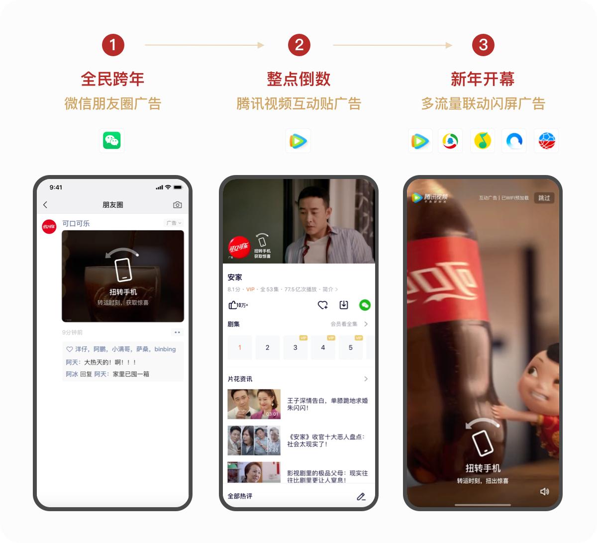 值得注意的是,即便在主概念上均采用了“扭转”这一核心创意,腾讯针对广告出现的不同流量场景,结合场景的差异化特质对“扭转”创意的执行细节进行了适配优化。比如微信朋友圈“扭转式卡片广告”,让广告形态与朋友圈信息流的上下文语境贴合,更加原生化;五大App的“扭转式闪屏广告”则主打高曝光场景,成为用户开年第一刷的阵地,尤其适合新品快速打出知名度或者成熟品牌借助新年窗口焕新形象和加强情感联结;腾讯视频的“扭转式互动贴”则定点出现,且多次定点触达,让消费者在新春节点随时扭动手机体验跨年仪式感,在温情时刻与内容场景下通过陪伴感持续加深品牌印记。
