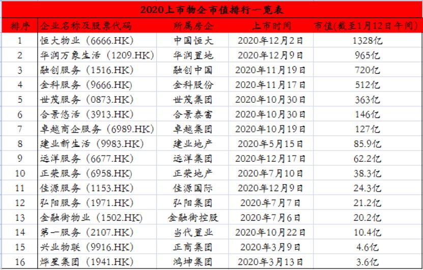 开年或受政策利好因素影响,物业股大涨,去年新上市物企华润万象生活以及恒大物业还一跃突破千亿市值,成为继碧桂园服务之后加入千亿市值行列的两家物企。截至发稿日(1月12日午间),华润万象生活股价微降市值965亿,其余两家市值依旧千亿在线,碧桂园市值1837亿,恒大物业1328亿。