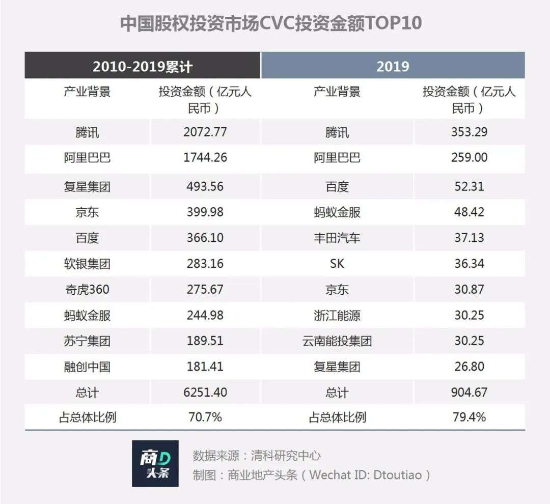 据清科研究发布的《2020年中国公司创业投资(CVC)发展研究报告》,过去10年,中国股权投资市场CVC投资金额TOP10公司,就有BATJ、复星集团、蚂蚁金服、融创中国等表现不俗。