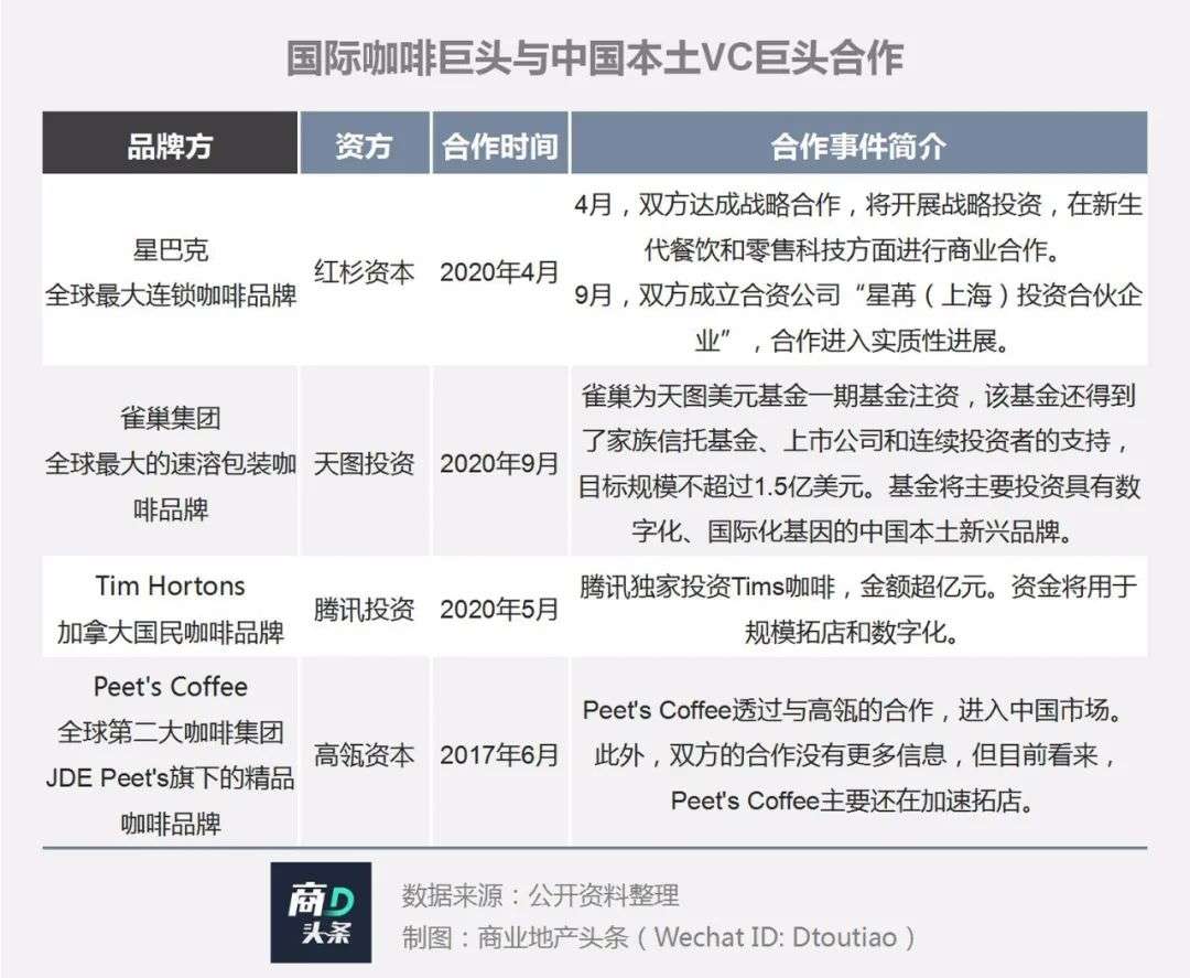 除了瑞幸,与资本过招的国际咖啡巨头,还有星巴克、Tim Hortons(以下简称Tims)、雀巢、Peet’s Coffee 。它们从国外走来,却先后与本土VC巨头组上了CP。