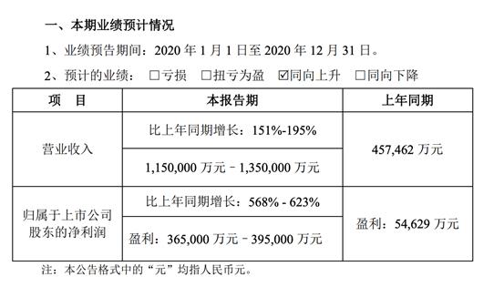 公告显示,预计2020年公司的营业收入为115亿元-135亿元,净利润为36.5亿元-39.5亿元,同比增长568%-623%。