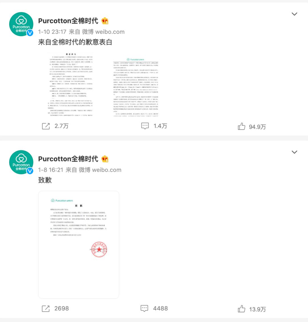 第一次是因为卸妆棉广告被指侮辱女性,被网友骂上了热搜。事后,全棉时代两度在官方微博道歉。