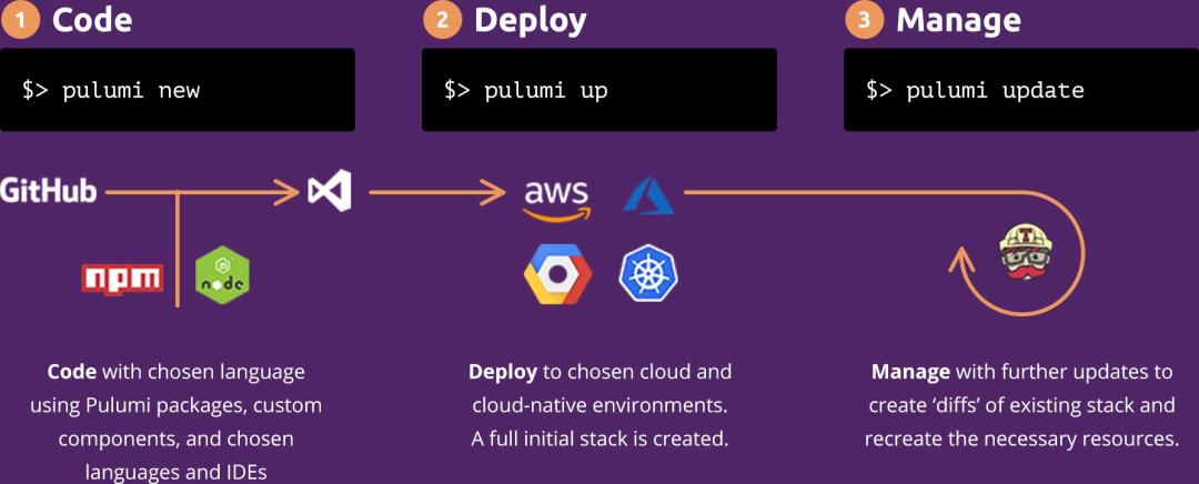 Pulumi让用户能够以各种自己熟悉的语言来配置其基础设施,这些语言包括Python,Javascript,TypeScript,Go以及.NET。只要用户掌握对应的工具链和一组框架,就可以轻松地管理多个云平台的基础设施,目前Pulumi已经支持包括亚马逊AWS,微软Azure,谷歌云,Kubernetes,阿里云在内的50多个基础设施提供商。