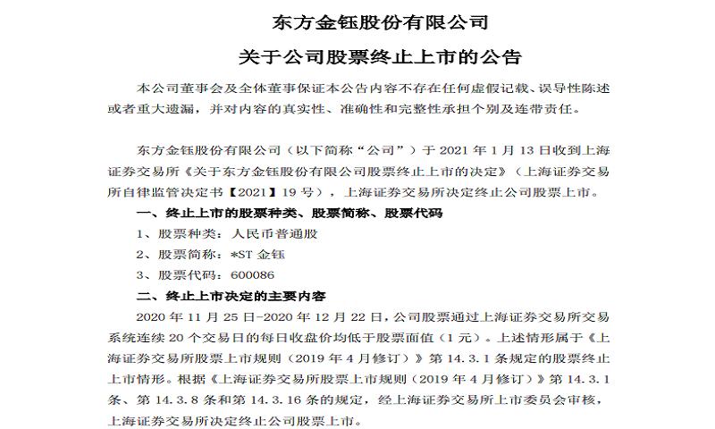 1月13日晚,上交所发布公告称,东方金钰股份有限公司(下称“东方金钰”)股票因自 2020 年11月25日至12月22日,通过上交所系统连续20个交易日的每日收盘价均低于股票面值(1 元),按规定被终止上市。