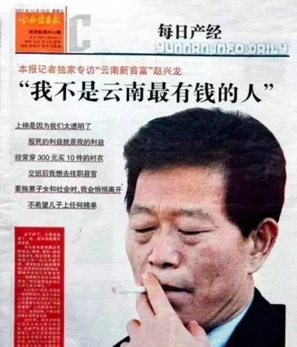 2007年,赵兴龙家族以27亿身家出现在胡润百富榜中,而52岁的赵兴龙则首次登上了云南首富的宝座。当年在接受《云南信息报》采访时,赵兴龙表示,“我不是云南最有钱的人,股民的利益就是我的利益,要拖累子女和社会时,我会悄悄离开。”